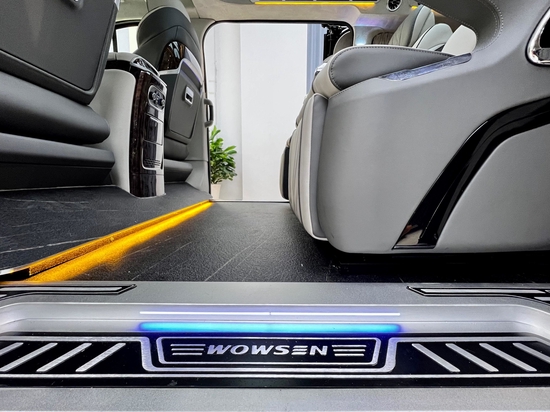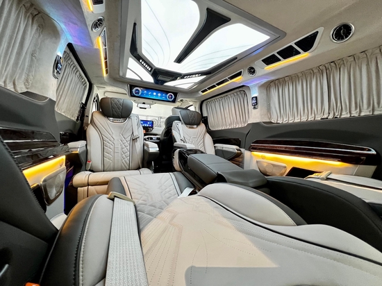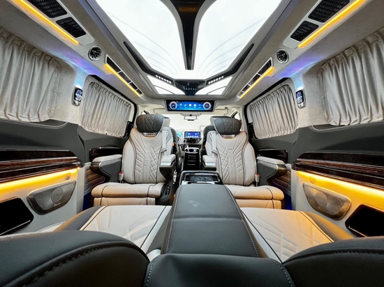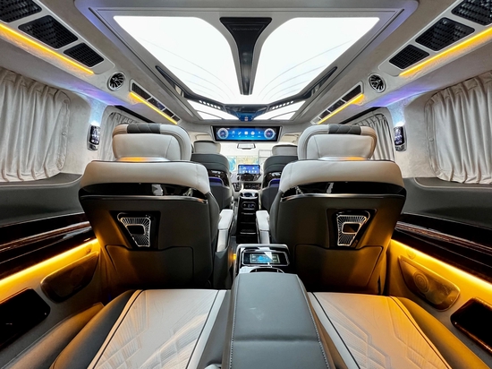来到乘客舱,上门处的迎宾防滑踏板彰显档次,地板采用高密度耐磨材料,具备隔音性好、保温性好等特点,还可以隔绝轮胎行驶过程中产生的近80%的胎噪,使车内达到最佳的舒适环境。侧墙我们均采用GMT新型复合材料,具有消音、隔音的作用,环保无异味。为了增加整车氛围感,配有车身氛围灯条,搭配车顶独家开模的高达顶灯,三色可调可根据使用环境进行调节,顶部还配备了24寸的智能液晶显示屏,可以同步车辆的车速、时间。也可进行智能办公、上网追剧等,满足你行车空间的所有娱乐休闲需求。
