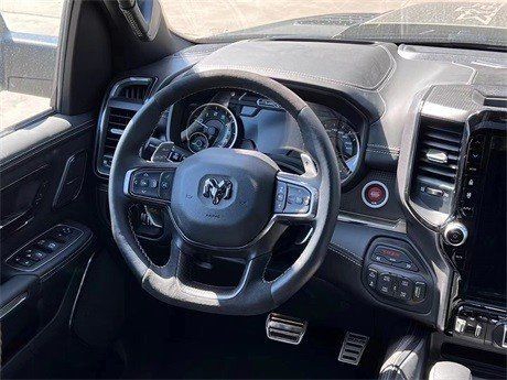 22款道奇公羊霸王龙TRX在内饰部分进一步强化了其高性能版本的形象,中控台和座椅随处可见的TRX标识便是最好的例证。同时,作为道奇Ram家族的旗舰车型,新车还配备了12英寸竖置中控屏幕,除了支持蓝牙、导航和车载Wi-Fi等常见功能,还支持Apple CarPlay和Android Auto手机映射。