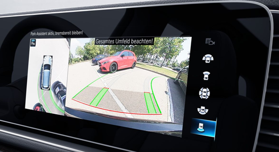 加版2022款奔驰GLE450带有360°摄像头的停车套件,可提供全方位视图,该摄像头在散热器格栅,行李箱盖把手和外后视镜外壳中具有四个联网的距离摄像头,信息清楚地显示在媒体显示中的可选视图中。