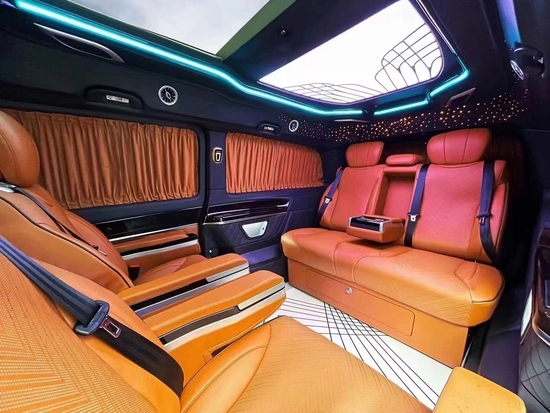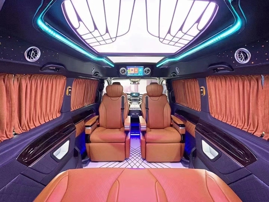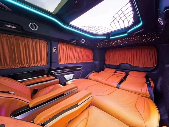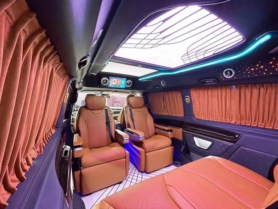 奔驰V260L改装VS680无隔断七座,内部装饰充满法国式的浪漫,九宫格灯珠镶嵌的椭圆形豪华顶棚造型设计气势磅礴,沿车身走向,两端与驾驶室隔屏和后门相衔接,形成古典对称的流线型图案。奔驰V250改装商务车全车新款电动精美布艺窗帘、控制车内电器的触摸屏操作,无不体现至尊豪华的商务形象,7座,家居、商用适合不过