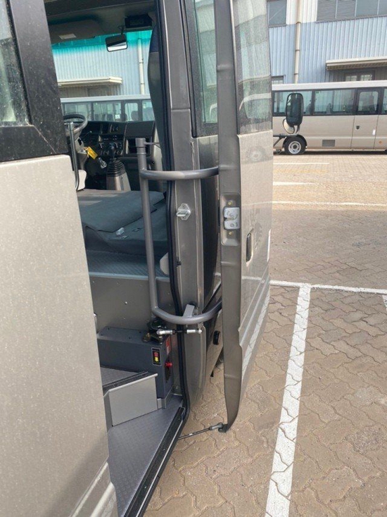 车辆配置:金色,发动机型号TB45A,汽油4.5L排量,直列六缸,双气囊,手动五档变速箱,107L大油箱,中门三级式台阶。装备:电动平移航空门,纳米材料环保绒布座椅。