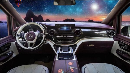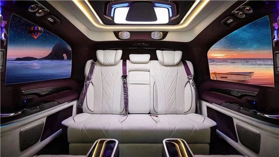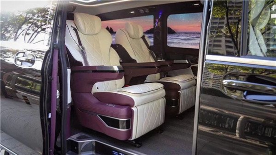 商务车的精华在于商务舱,两个航空座椅带有通风、加热、按摩、旋转、腿托、记忆等丰富的功能,所有的操控都在座椅侧面触控屏上,电子操纵简单方便又快捷;整车采用米色与紫色的双拼内饰,凸显了整车的大方、清爽的视觉感受。
