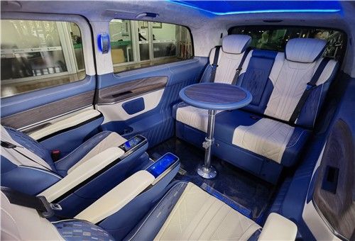 奔驰V260L改装七座商务车,模具一体化,全车内饰件模具化生产,新型材料安全环保,给客户提供一个舒适安全的乘车环境。隐藏吧台,隐藏式吧台椅,一键式打开与关闭,科幻感十足,打开可乘坐,关闭为一精美的吧台,既美观又实用。