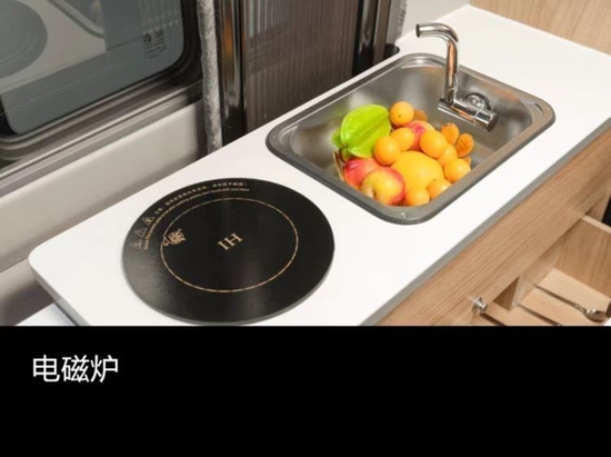 厨房区位于靠近乘客门的位置,采用一体式橱柜的设计,配置了电磁炉、洗菜池、折叠式水龙头、抽屉、储物柜等;橱柜左侧设有可拓展桌板,做饭时当做操作台、置物台使用,可操作性更强。