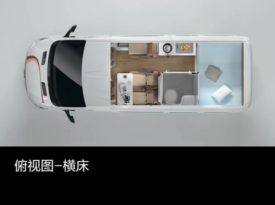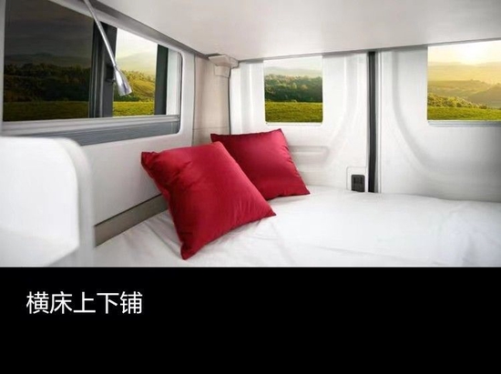尾部纵置上下铺,空间充足,可满足多人睡眠;上下铺均设有储物袋,可在夜间休息时放置手机、充电器等小件儿物品;下铺侧方设有车窗(含隐私玻璃、遮光、纱窗),加强日常采光通风,也方便休息时欣赏窗外风景;上铺为可翻折设计,不使用时可向上掀起,减少占用空间面积;上下铺床头的位置均设有阅读灯、充电插座,方便夜间休息时使用