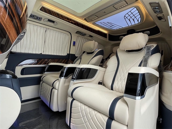 中排座椅改为了两张独立的航空头等舱座椅,支持360度旋转,集按摩、通风、加热、电动腿托等功能,通过座椅侧面对开关进行控制调节,可以保证极致舒适地乘坐体验。座椅能够向后进行旋转方便与后排乘员互动交流,而且具有完美的衬托感!