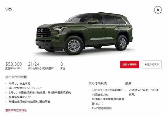 23款丰田红杉配置方面,全新丰田红杉总共推出了5款车型,分别是SR5、Limited、Platinum、TRD Pro和Capstone,全系都标配了丰田Safety Sense 2.5技术套件、前排座椅加热、全景天窗以及360度全景摄像系统等配置。2023款丰田红杉的外观采用了最新的丰田家族式设计语言打造,前脸大尺寸的进气格栅搭配造型犀利的大灯组以及厚重的下包围,整个前脸看起来十分硬派。侧面可以看到它的侧面线条和汉兰达 有些类似,不过它比汉兰达看起来更加的壮实。