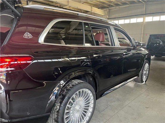 迈巴赫GLS600车身侧面非常霸气硬朗,双色拼接的车身显得外观更加奢华。车顶配有银色镀铬行李架,并且车窗周围搭配有镀铬饰条的装饰。迈巴赫GLS600的轮毂采用的是超大尺寸的密辐条样式设计,使得整个侧面看上去更加庄重奢华。并且在后车窗的后方还设置有非常标志的迈巴赫logo,凸显了这款汽车非常独特的身份。