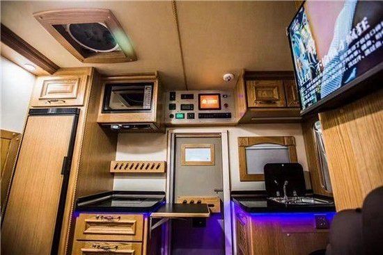 厨房区实木组合式橱柜采用分区域布局设计,由乘客门隔开,不同的功能相互呼应的同时也让做饭井然有序,橱柜推拉式抽屉便于存放日常生活用品及碗具。其它方面配备触摸式集中控制系统+机械式翘板开关、液晶电视、小米盒子、日本YAMAHA八喇叭音响系统(带低音炮)、抽油烟机、微波炉、西门子电磁炉、152L赛特福德房车专用冰箱、大宇3kg洗衣机、特鲁马燃油暖风热水一体机、四路监控、一氧化碳/烟雾报警器等。室内多个220V、12V电源插座及USB充电接口可满足日常充电需求。