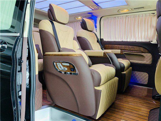 奔驰威霆改装无隔断七座商务车第二排座椅采用两个62S首长级座椅,带加热,按摩,通风,一键式电动调节记忆等功能。奔驰威霆改装七座无隔断座椅符合人体工程学设计,同时带有电动椅背调节,电动头枕,电动前后调节,180°旋转,一键式伸缩腿托功能,带来头等舱级舒适体验,,私家客厅级后舱体验,180°旋转后可以与第三排电动沙发床进行无缝拼接,满足两个成年人一个小孩的正常休息,带来卧室级舒适享受。