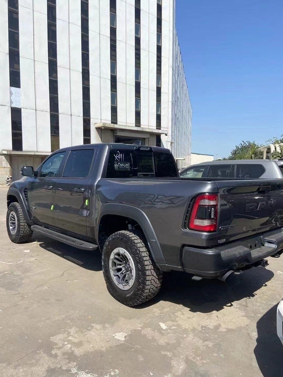 道奇公羊霸王龙1500TRX天津港价格道奇公羊霸王龙家族高大威猛的造型设计,同时细节部分融入了更多高性能元素,包括经过黑化处理的前格栅,引擎盖两侧的黑色进气口,以及为了容纳巨大的机械增压器而设计的通风口等等。此外,新车还配备了视觉冲击力更强的黑色轮眉和外露式的拖车钩,看上去十分霸气。