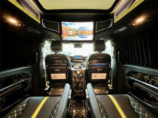 奔驰作为世界一线豪车品牌,在商务车中的品牌效应也是十分强大的。本身的空间优越性以及安全配置也属顶尖层次。今天就为大家介绍一款奔驰V级高顶七座定制款——金提香款。金提香版整体外观方正大气同时线条流畅,让人视觉效果更显饱满立体,看上去恢弘大气十足气派。加高顶设计让整体框架格局更加别致,勾勒出完美的气度形象。