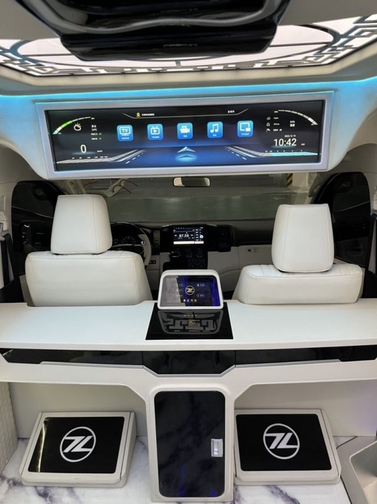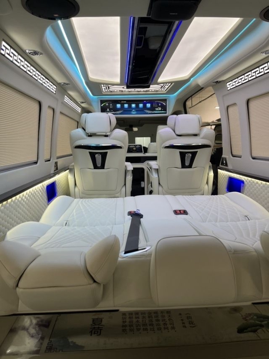 配置:海狮新中栻!自主设计、研发新款改装方案 参数配置: 车身尺寸:长:5915mm、宽:1950mm、高:2280mm 发动机:V6自然吸气发动机 变速箱:6挡手自一体 马力:282匹 驱动方式:前置后驱 排量:3456ml 轴距:3860mm 油箱容积:65L 整车质量:2530KG 改装具体配置: 外观: 埃尔法 (配置|询价)款包围(雾灯、大灯及总成) 镀铬中网、镀铬后视镜、镀铬牌照架、镀铬门把手 16英寸皇冠版锻造轮毂 内饰: 触屏款航空座椅(带电动头枕)+沙发床(中央控制屏) 镂空中国风顶灯与侧壁灯带、吧台 铝制定制款带灯迎宾踏板 38.5寸曲屏吸顶电视、9寸中控显示大屏(导航+环影) 主副驾真皮座椅、通风、加热、主6副4电动 全车隐私膜、全车加强版隔音、全车NAPPA真皮包覆 JBL音响、电中门、高端定制版木地板、黑钢琴漆方向盘 中央扶手双开门冰箱、空调管道、暖风机改造、百叶窗