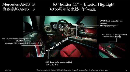 梅赛德斯-AMG G63 "Edition 55"特别版有黑、白两种车漆颜色,标配22英寸哑光轮圈,可选AMG暗夜\暗夜II套装。内饰方面是醒目的红黑组合,"Edition 55"字样出现在AMG高性能方向盘上。