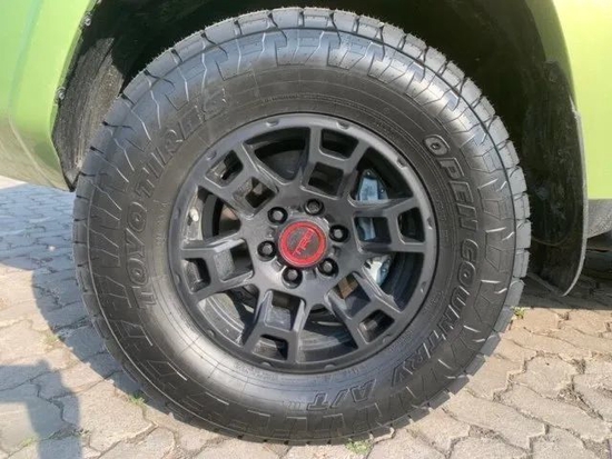 丰田超霸细节方面,作为一款地地道道的越野车型,轮眉提升角度较大,与轮胎之间的距离足以满足您在不同的路面随心驰骋,加之锻造式的轮毂,非常的坚实,碰到石头几乎是没有问题的,匹配的是越野式的轮胎,可以适应各种路况,可以提供很好的摩擦力