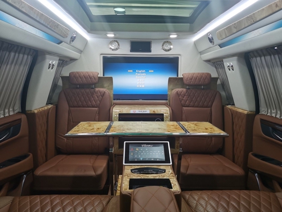5.98米四座凯迪拉克总统一号两个主座椅为航空按摩座椅,支持多种调节,放平功能,操控都集成在座椅中间的触控屏上,下还内置了一个升缩咖啡机,空间利用上非常合理。凯迪拉克拉克总统一号是空间感私密感都有很好的突出,后背箱储物比较宽敞,长途旅行和商务接待顶级座驾。