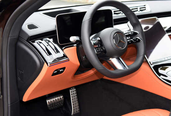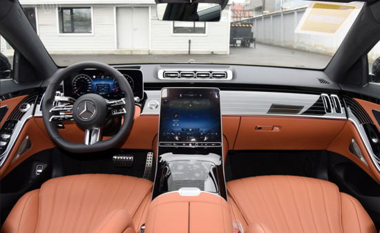 在内饰设计上,奔驰S500都不能用豪华来形容,简直就是奢华总统小套房,中控部分搭载了双屏设计,12.8英寸的中控大屏以及12.3英寸的悬浮式行车电脑屏和HUD投影显示,配上棕色的内饰设计以及高亮的钢琴烤漆面板,将科技感与时尚感完美融合在一起。