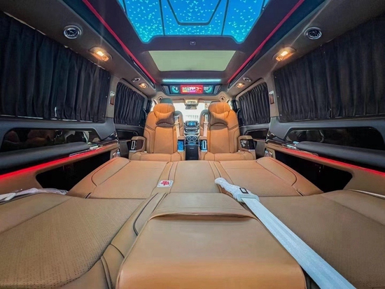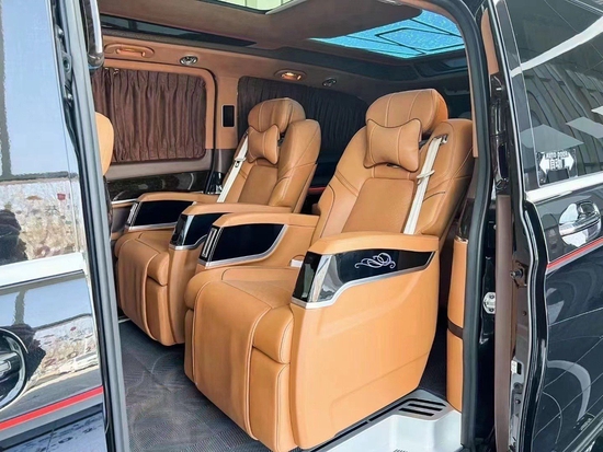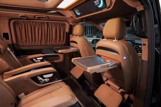 奔驰V260L改装隐藏六座全隔断商务车,后排座椅采用两个迈巴赫62S首长级座椅,带加热,按摩,通风,一键式电动调节记忆等功能。奔驰V260L改装高顶隔断商务车座椅符合人体工程学设计,同时带有电动椅背调节,电动头枕,电动前后调节,一键式伸缩腿托功能,带来头等舱级舒适体验,私家客厅级后舱体验。奔驰V260改装迈巴赫VS900商务车内饰的整体设计是婉约柔和的,整个采用米色为主色调,更显淡雅清净内饰也是定制升级过的,显得高端大气。定制风格采用经典的元素,宽大的航空椅配上舒适头枕,坐在上面就想美美睡上一觉,座椅带有8向的电动调节,超长的腿拖和按摩功能智能座椅甄选顶级材质,菱格纹理彰显精湛手艺。