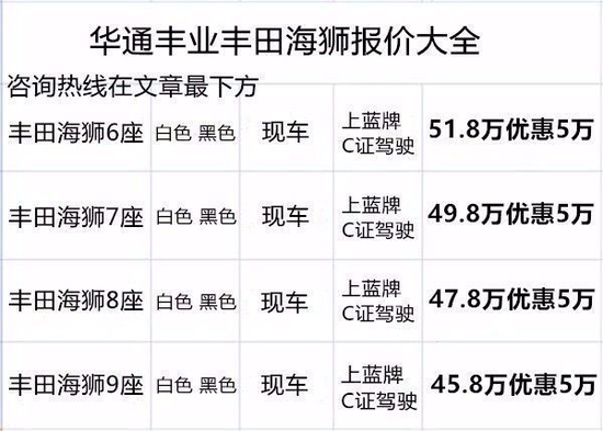 ◤丰田海狮4s店◢华通丰业出售2022新款改装6座、7座、8座、9座、13座(奢华版、旗舰版、VIP版超VIP尊贵版、至尊旗舰版)华通丰业合格证与座位相符全国实拍! 丰田海狮(6座/7座/8座/9座10座/11座/12座/13座),9座以下丰田海狮可上蓝牌! 实力大厂,值得信任,欢迎来电详询!专业改装参谋为您服务!质量担保,价格优惠.提供板车运输服务本公司现场改装,主要运营丰田考斯特 (配置|询价)商务车型。销售热线:13011185333 魏经理 同微信