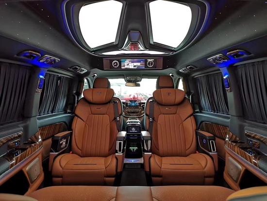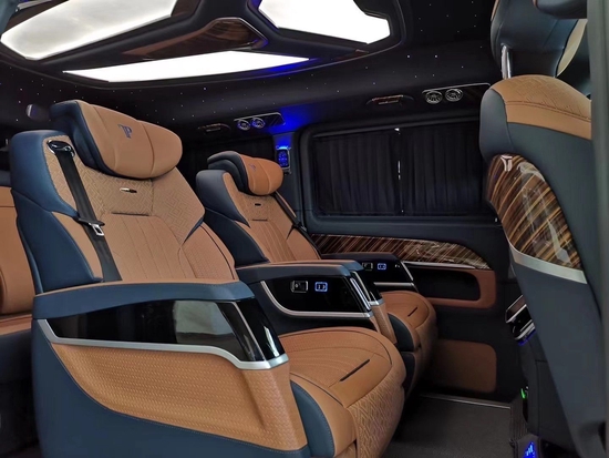 2022款奔驰V260L改装商务车第二排航空座椅为带电动、加热、按摩、通风功能的航空级首长席,可沿着地面上滑轨实现一键电动式前后滑动,对于这种智能化的乘坐体验,是原厂车型笨拙的手动拖拽模式所望尘莫及的。车内的氛围灯打开后,奔驰V260内舱变得灵活多变,气氛也可以根据主灯颜色变换而变化,主要的乘坐座椅配置的独立的按摩功能,通风加热,一体腿托,功能丰富,乘坐舒适,是商务接待用车的代步良品