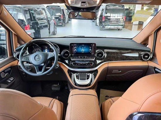 这款2022款奔驰V260商务车采用高强度和拥有黑黄金美誉的碳纤维材质设计打造,全车共有35处采用碳纤维材质,如车辆前后包围、前机盖、顶部、侧包围等。这款2022款奔驰V260商务车驾驶舱配置高真皮包覆中控台,10.25寸悬浮式多媒体中控屏,碳纤维包覆多功能方向盘,方向盘集成换挡拨片、银色物理功能按键,四出可调节前舱空调出风口,主副多功能真皮座椅,一体式带车载冰箱的扶手箱。