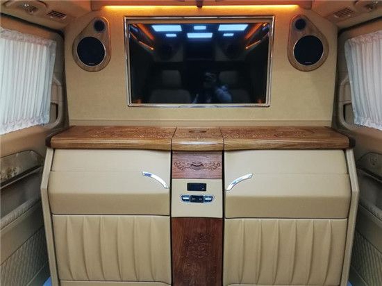 奔驰V260L盛世祥云版隐藏6座(对坐版)房车,娱乐性功能体现倒也是别具一格,32寸升降液晶电视也被首次引入奔驰V260L房车的设计,此外前、后置高保真音响组合立体环绕式声场,一套移动式家庭影院的私享配备。前后舱无隔断设计应该属于更偏向于家庭化的设计了,驾驶舱扶手箱后侧多是一些实用的功能体现,诸如恒温杯托、后舱电器触控屏等;那么如果是多用于商务接待,全隔断式的奔驰V260L房车是个不错的选择。
