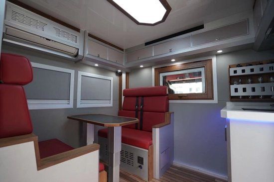 车内实木(美国红橡)搭配拉丝铝板家具+环保型房车专用柚木地板革;布局方面,采用了会客区对卡座沙发+气动升降餐桌+实木组合式橱柜+卫生间+车尾横置上下床的布局结构设计,全车的储物空间非常丰富,对于长期户外旅游者来说实用性高。暖色系氛围更贴居家效果,让成员即使在外旅行也能感受到住家的感觉。会客区真皮软包对卡座沙发满足4人乘坐,卡座沙发搭配气动升降餐桌可变为一张沙发床;固定式安全带保护行车途中乘客的人身安全。坐垫厚实,弧形靠背也提供一定的支持感,整体来说乘坐舒适感还是不错的;沙发内侧墙壁2个独立外推窗,提供采光及通风换气效果;格力24V变频空调制冷效果快,可手动调节温度;吊柜方便日常收纳物品。
