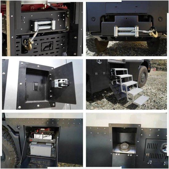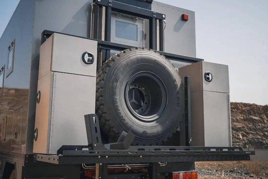 车身四周外市电系统功能齐全,其它方面包括进口CAMPO房车专用3.5米电动遮阳棚、重力注水口、外置淋浴器、3KW静音发电机、1650W单晶高效太阳能板、1600Ah磷酸铁锂电池(含充电机)、德国纽福克斯 3000W+3000W逆变器(防辐射处理)等。标配前12000磅+后20000磅的绞盘,对于野外自身脱困能力起到了很好的效果,另外在车队行进途中还可以帮助其它同行的车友,提高相互配合默契度的同时也彰显自身优秀的越野能力。