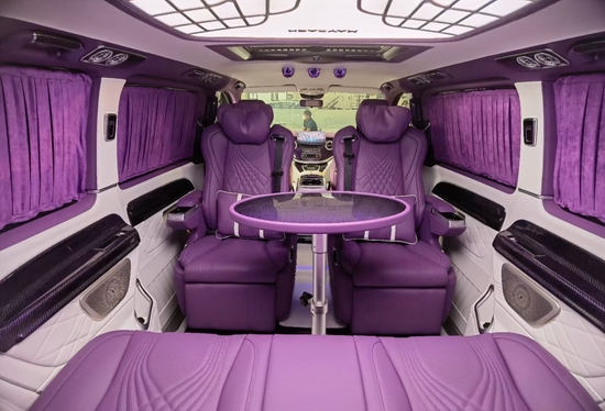 奔驰威霆版以下是贵宾舱二个总裁座椅,这二个座椅具有记忆功能,何为记忆功能呢?就是一键展开及一键收回,这个座椅是根据人体工程学设计而成,能一键式找到您身体最舒适的角度。在总裁座椅双侧有两个隐藏式桌板。总裁座椅中间有个热感电子触摸屏幕可控制后舱设备,屏幕下方有个“语音控制系统”也可控制整个贵宾舱的设备。