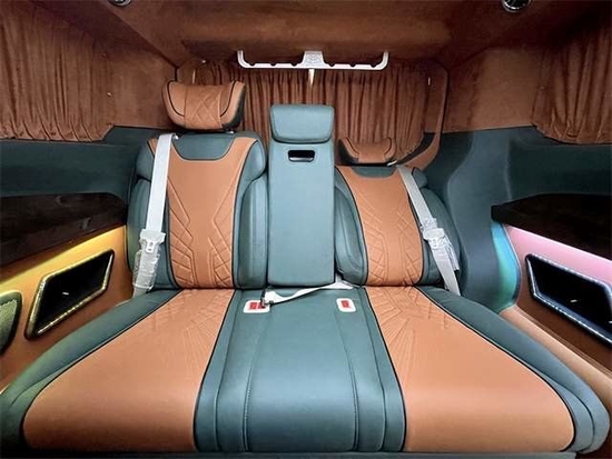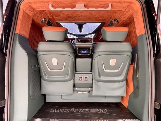 第2排的航空座椅也是多项的调节,通风,按摩,加热,旋转,腿托等功能性具备。人体工程学6点位智能气动按摩,旅途的生活也能多一些享受与自在。第3排电动调节,配有无线充电,它既可以是一个沙发床,也可以由两个独立的座椅所组成,两个款式两种布局,可满足不同用车的需求。双侧电动滑门,可选装电动后尾门。高达的定制顶灯,有多款颜色可以调节,适应车内不同的用车氛围。无线网络电视机连接车载WiFi或者手机热点,既能唱歌也能观影。全车升级VVCAR,9.1声道的音响,并带有GPS处理器,这种声觉效果,视觉效果,车内都有体现。
