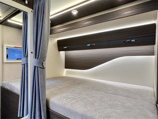 休息区位于车尾部,横置床的设计,将尾部拓展后,空间可以容纳两个人休憩。床铺周围贴心地设计了阅读灯,夜晚来到,打开小灯就可以静享阅读时光。仔细看床铺顶部,会发现顶灯造型十分具有美感,暖黄的灯带营造出满满的温馨感。水电方面,整车配置有300L净水箱、40L灰水箱和60L黑水箱,均采用环保抗菌水管;电力方面标配(48V)3500W的充电逆变一体机,(48V)12.5kW·H的磷酸铁锂电池和1200W的太阳能电池板。感兴趣可以留言私信或添加微信:YH18017691185。