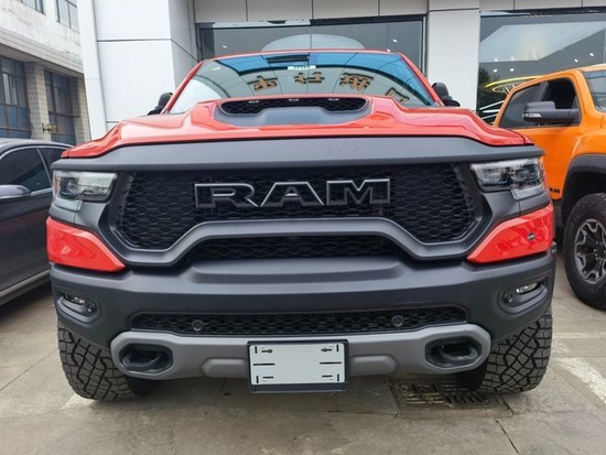 22款道奇公羊霸王龙TRX国六最新款新车传承了道奇RAM家族高大威猛的造型设计,同时细节部分融入了更多高性能元素,包括经过黑化处理的前格栅,引擎盖两侧的黑色进气口,以及为了容纳巨大的机械增压器而设计的通风口等等。此外,新车还配备了视觉冲击力更强的黑色轮眉和外露式的拖车钩,看上去十分霸气。