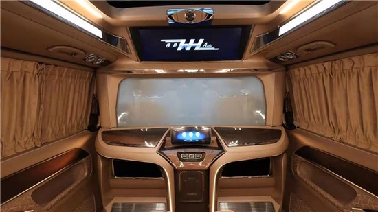 定制的黑曜石纹理地板,拥有海洋一样的蓝色和魅力,经过麂皮绒包裹的顶棚细腻精致,电动开合大天窗以及可以满足不同需求的灯组,让车内的灯光氛围可以根据需求进行改变,无论是查阅资料,签署文件或者是阅读都可以拥有最适合的灯光相伴。后舱与驾驶舱通过隔断完全隔开,隔断处有碳纤维材质的储物格,中央屏幕为整车控制区域。顶部还配备互联网液晶电视。中间部分则是一块升降玻璃,可以随时保障后舱的隐私,并且还带有雾化的功能。