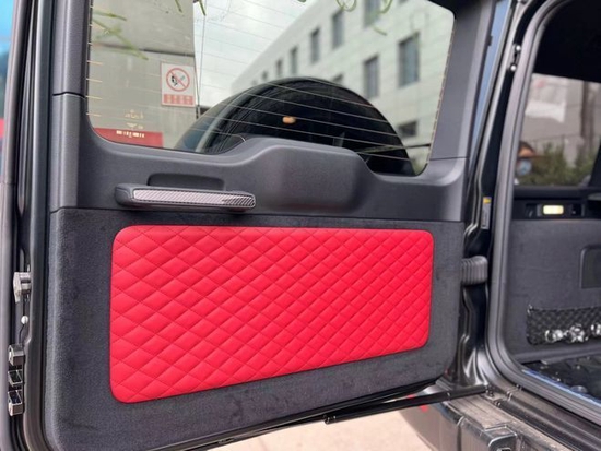 磨砂月光白/孟加拉红菱形格座椅,红色刹车卡钳,磨砂碳纤维内饰,G制造内饰增强包(AMG独家Nappa菱形格座椅,nappa真皮仪表台,多功能前座椅带加热通风按摩,AMG头枕和脚垫,乘客徽章握柄)