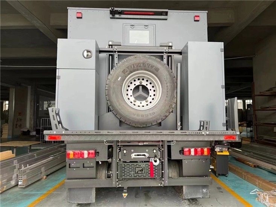 该车不仅把外观上的肌肉、硬派越野风做到了极致,在动力上也是性能十足!其搭载的一台6缸10.5T MC11柴油涡轮增压发动机和一部卡特法士特合资6AT全自动变速箱所组成的动力总成,最大功率可达360PS,峰值扭矩更是达到了1800N·m,且整车标配400L铝合金柴油油箱,综合可续航可达到1600公里。在加上该车标配的5部425/65R22.5尺寸全地形越野轮胎