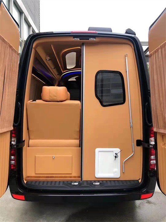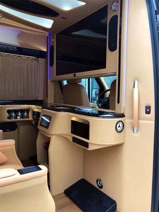 国六奔驰斯宾特商旅版仍然可以私人定制,内饰颜色、风格搭配、布局都可以自行定义。商旅版一般核载6人:正副驾驶座椅背后带全隔断版的,隔断处的电视带升降功能,带有吧台,吧台上可以设置杯托、咖啡机、茶台、酒柜、储物抽屉等;二排座椅是两个高端航空座椅,且带有旋转功能;车尾部左侧可以设立二联排电动沙发床,右侧可以设一体式立卫生间,卫生间的前面还可以设立一个厨房区域,可以设立水槽、电磁炉、微波炉、储物柜等。