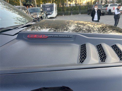 22款道奇公羊霸王龙6.2V8机械增压,710马力扭矩880,新款霸王龙家族高大威猛的造型设计,同时细节部分融入了更多高性能元素,包括经过黑化处理的前格栅,引擎盖两侧的黑色进气口,以及为了容纳巨大的机械增压器而设计的通风口等,新车还配备了视觉冲击力更强的黑色轮眉和外露式的拖车钩,看上去十分霸气。
