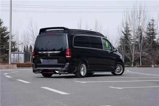 奔驰V250改装商务车立体柱状的车尾灯美观大方与众不同,流线型高顶给全车增添了几分律动美,双出棱形排气孔也是独特让人注目。