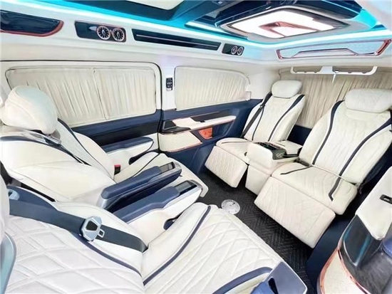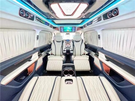 进口奔驰V250商务车内饰方面同样做了整体的升级,中控台、方向盘、门板、车侧壁、车顶、进门的踏步整体升级包覆。正副驾驶座椅升级包覆、正副驾驶座椅中间加装车载扶手冰箱、正副驾驶133座1185椅6676头顶定制宽屏车载网络电视、正副驾驶座椅椅背后方加装可伸缩的小桌板。133-1185-6676