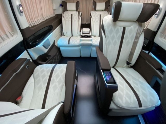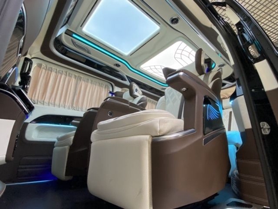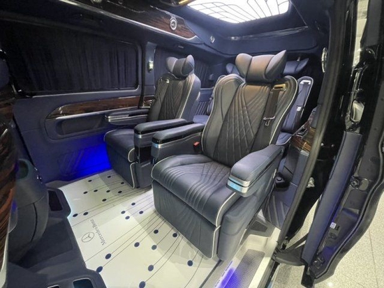 2022款进口奔驰V250商务车车内的座椅也全部都改头换面了,全航空独立座椅,多达10项的方向调节,更可以全座椅旋转向后,和三排座椅形成对坐格局,座椅加热,按摩,通风功能一样不少,这样的座椅小编只在航空头等舱中见到过。