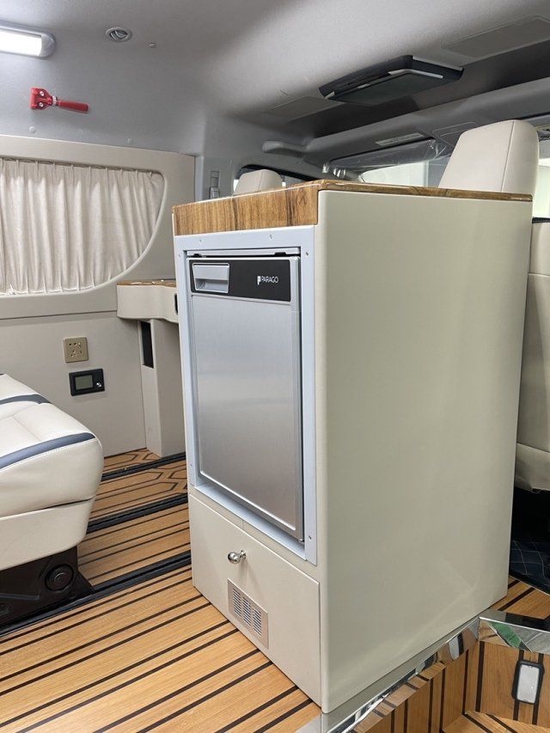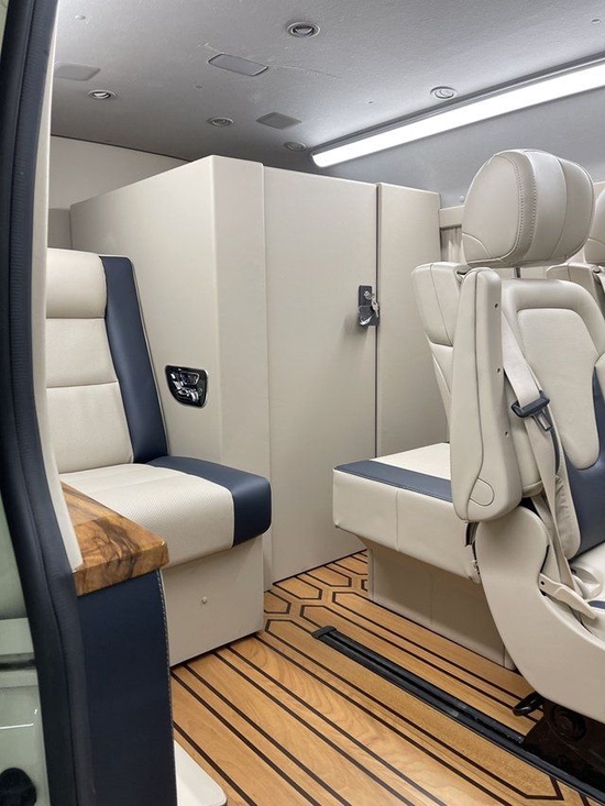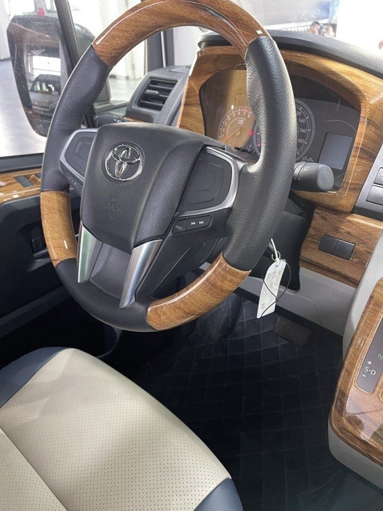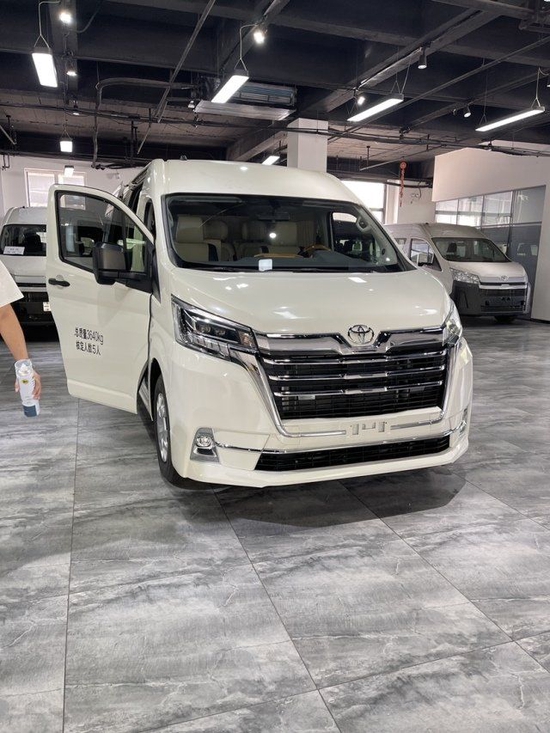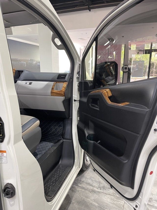 丰田海狮整车升级了加强型的隔音隔热处理,车内带空气净化系统,无线充电系统。在进门侧加装了氧化铝脚踏带迎宾灯的,整车都是采用纳帕级皮质进行包覆的,侧壁红木装饰,手动百褶窗帘,后舱暖风系统,最后说说棚顶灯光,这个有智能触摸控制系统。灯光超级棒。华通丰业丰田(进口)海狮-HIACE采用2+2+2+3四排九座的设计,第二排和第三排均配备了埃尔法 (配置|询价)同款独立航空座椅具备(通风,加热,腿托,旋转)等功能。