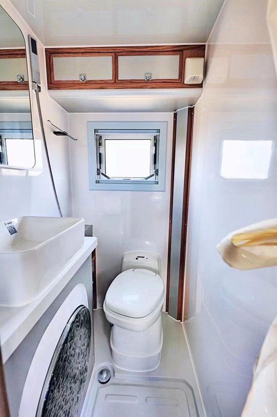 卫生间采用干湿一体式设计,内部配备赛特福德马桶、洗手池、梳妆镜、换气扇、淋浴花洒等;大宇3kg洗衣机免去了手洗的时间,提高了生活效率;水路系统方面,400升净水箱、75升灰水箱。整车上下水系统做了防冻处理,更好的适应极度严寒等恶劣环境。