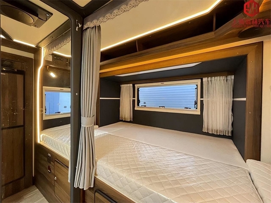 尾部的床铺同样位于拓展舱处,打开前是一张单人床,打开后就是双人床了,床铺三面环窗采光通风都非常棒,顶部设有吊柜可摆放小件行李,床铺下方设计了储物柜可使用。使用舒适、健康的天然乳胶床垫,周围搭配有阅读灯、氛围灯,可满足日常使用。床头出配备有220V电源插座以及USB借口,方便给手机充电。