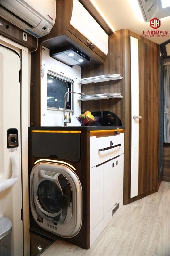 车身内部采用北欧风格的装饰,明亮、简约、大气。车厢中部会客区设有双人对坐沙发卡座上方带有符合国际标准的儿童座椅插口,上方配有多组储物柜,卡座中部升降桌放下后可拼成床铺,外出旅行时可以睡两名儿童;卡座沙发后方则是一台152L赛特福德房车专用冰箱,冷藏冷冻都可以,不用担心食物变质,安全可靠。