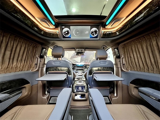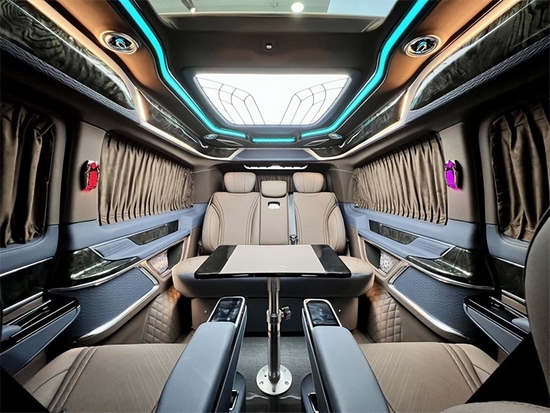带有超豪华的独立大天窗,空间视野立体,宽敞舒适。通透性无隔断内部空间设计,沟通前后舱,促进车内人员友好沟通。24.8寸多媒体娱乐互联网电视,满足车内人员基础娱乐享受。绒布窗帘,以及后排隐私玻璃,保护车身内部用户的隐私需求。整车覆盖超纤皮革,配备防震棉和隔音棉。