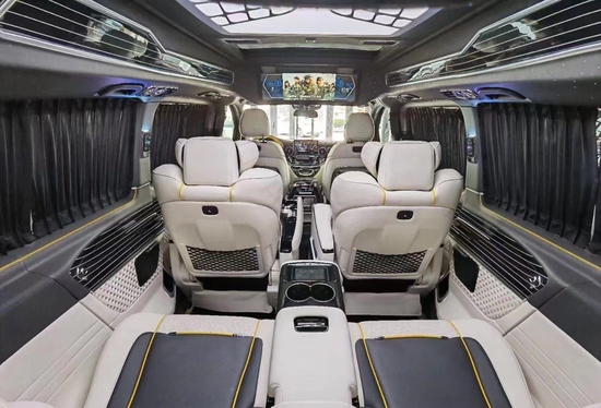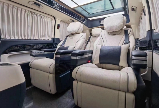 奔驰V260L改装4+2隔断版行政总裁,进入后舱立刻就会被它的豪华绚丽而征服,驾驶舱与后舱是分隔设计,形成两个独立的空间。隔断吧台采用42寸超大液晶升降电视,带投屏功能。奔驰V260L改装4+2隔断版行政总裁,吧台与座椅完美结合,下方是隐藏式酒柜,合理利用了车内空间,使您接待贵宾不失格调。奔驰V260L改装4+2隔断版行政总裁内饰,地板采用手工拼接马毛地毯,大气高贵。