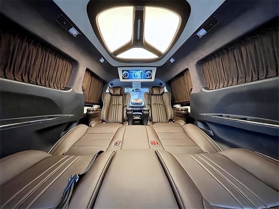 车内顶部为采用的是麂皮绒的软包加上星盾天幕顶灯,除了这些基本的功能性以外,整车在看不到的地方,比如四周全部做了隔音的处理,窗户上都加装的是高级私密窗帘,既可以避免阳光的直接照射,维护车内的一个用车环境,也可以很好的保护我们车主的隐私。