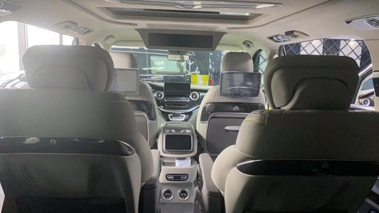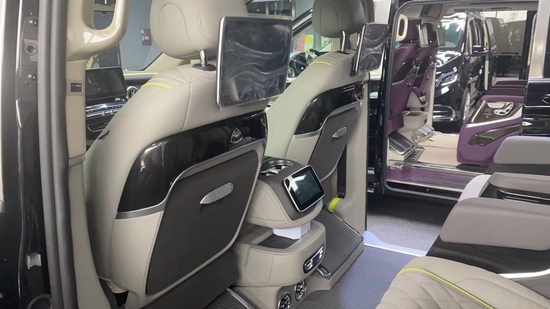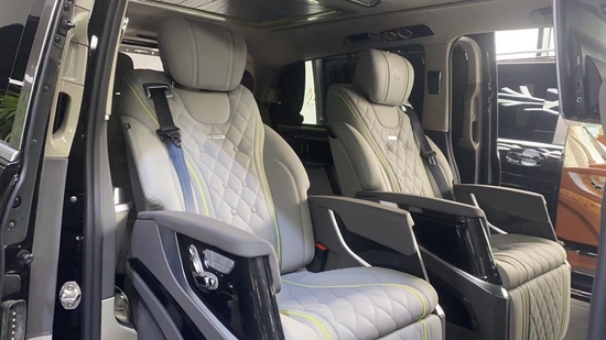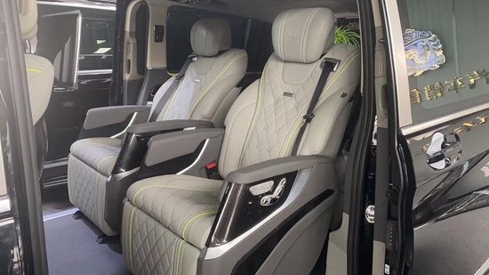 奔驰V260L改装隐藏六座全隔断商务车,后排座椅采用两个迈巴赫62S首长级座椅,带加热,按摩,通风,一键式电动调节记忆等功能。奔驰V260L改装高顶隔断商务车座椅符合人体工程学设计,同时带有电动椅背调节,电动头枕,电动前后调节,一键式伸缩腿托功能,带来头等舱级舒适体验,私家客厅级后舱体验。奔驰V260改装迈巴赫VS900商务车内饰的整体设计是婉约柔和的,整个采用米色为主色调,更显淡雅清净内饰也是定制升级过的,显得高端大气。定制风格采用经典的元素,宽大的航空椅配上舒适头枕,坐在上面就想美美睡上一觉,座椅带有8向的电动调节,超长的腿拖和按摩功能智能座椅甄选顶级材质,菱格纹理彰显精湛手艺。