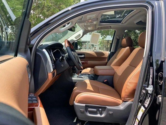 22款加版丰田红杉5700铂金版 颜色:灰/棕 配置:381马力/544牛米,七座,天窗,两驱四驱自由切换,LED大灯,LED雾灯,12气,中央差速锁,JBL音响,多种驾驶模式,雷测自动跟车,驾驶辅助包,车道偏离预警,智能卡,桃木内饰,真皮,大屏,电动多向调节带记忆座椅方向盘,低盘升降,三驱空调,前座椅加热通风,后座椅加热,二排航空坐椅,带庶阳帘,二排中央扶手,吸顶DVD,三排坐椅电动,电动后车窗,电尾门,拖车包,桃木方向盘,隐私玻璃,二三排遮阳帘,外观镀铬套件,踏板。全车镀铬