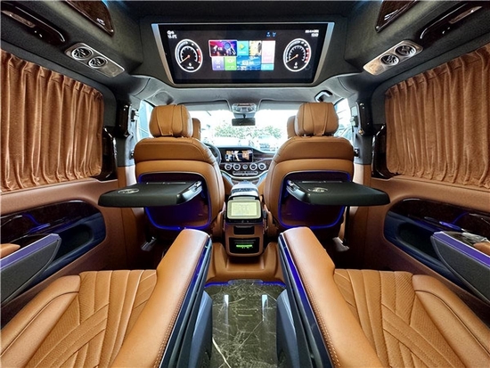 整车的内饰颜色采用了宾利黄,整车内的色彩显得沉稳大气;将奔驰迈巴赫的浅色系色彩运用于车辆上半部分,让整车内饰看起来空间感更加宽敞。大量的真皮包覆以及麂皮绒包袱不仅大大提升了档次,后期打理起来也方便。